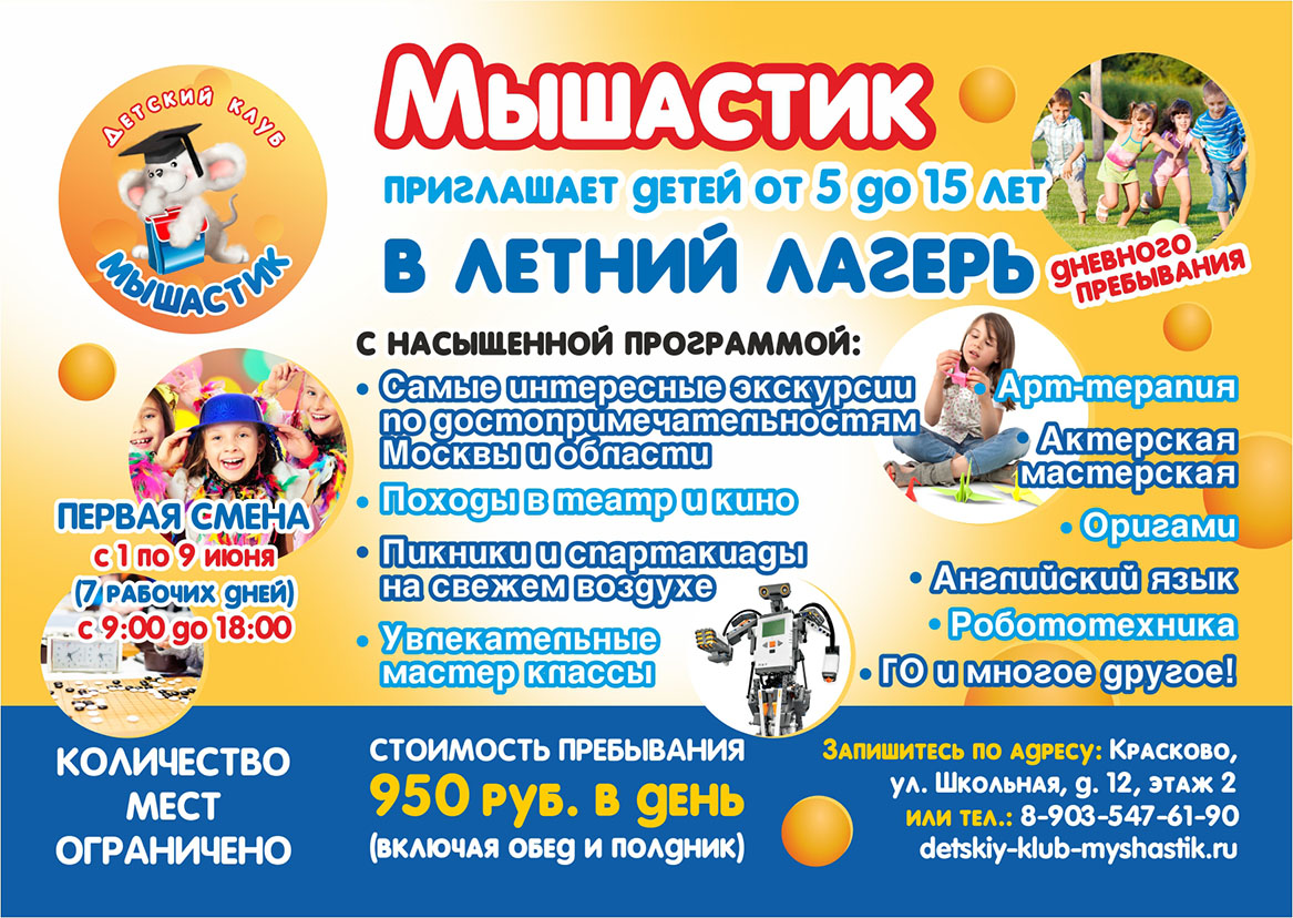 Приглашаем детей от 5 до 15 лет в ЛЕТНИЙ ЛАГЕРЬ дневного пребывания.